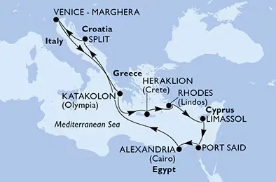 Otkrijte čari Istočnog Mediterana na nezaboravnom 12-dnevnom krstarenju koje obuhvata Italiju, Grčku, Kipar, Egipat i Hrvatsku!U aranžman su uključeni organizovani povratni autobuski prevoz, jedno noćenje u poznatom letovalištu Lido di Jesolo, usluge vodiča tokom puta, kao i sve lučke takse i napojnice za brodsko osoblje.