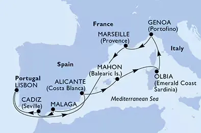 Upustite se u jedinstvenu mediteransku avanturu koja vas vodi kroz osam fascinantnih destinacija: od romantične Đenove i šarmantnog Marseja, preko sunčane Malage i Kadiza, do istorijom obasjanog Lisabona, španskog Alikantea, prelepog Mahona i neodoljive Sardinije. Putovanje počinje organizovanim povratnim letom i noćenjem u Đenovi, a zatim sledi 11 dana luksuznog krstarenja. U aranžman su uključeni svi transferi, iskusni vodič, kao i lučke takse i napojnice za brodsko osoblje – sve što vam treba za bezbrižan i potpun doživljaj.